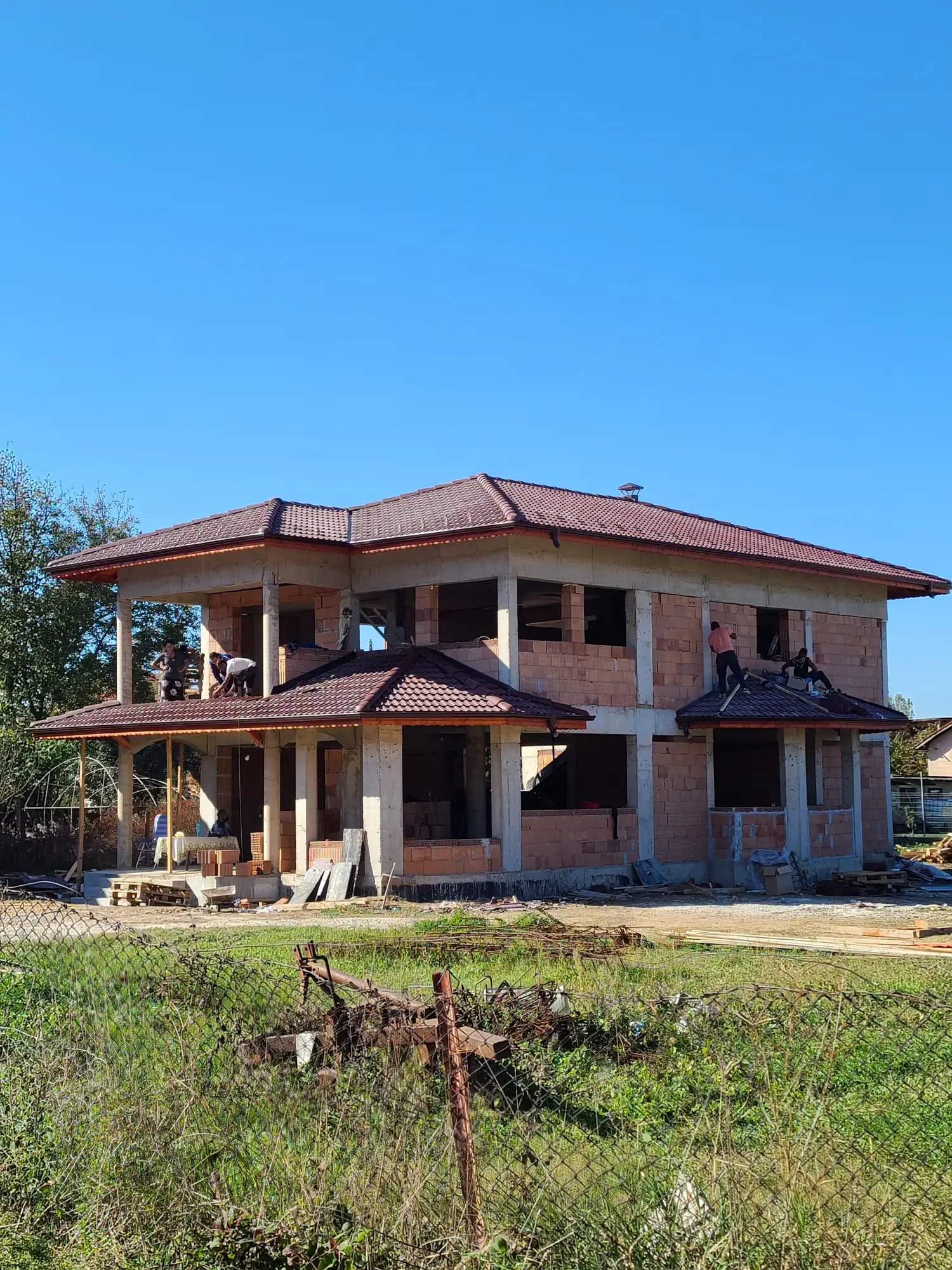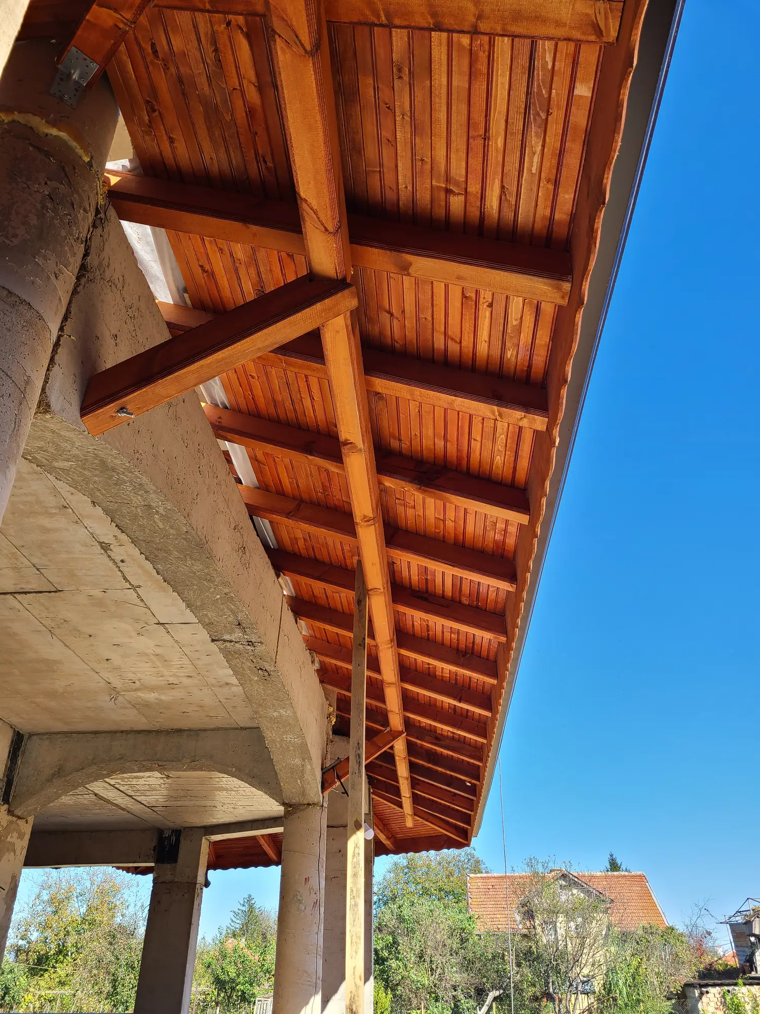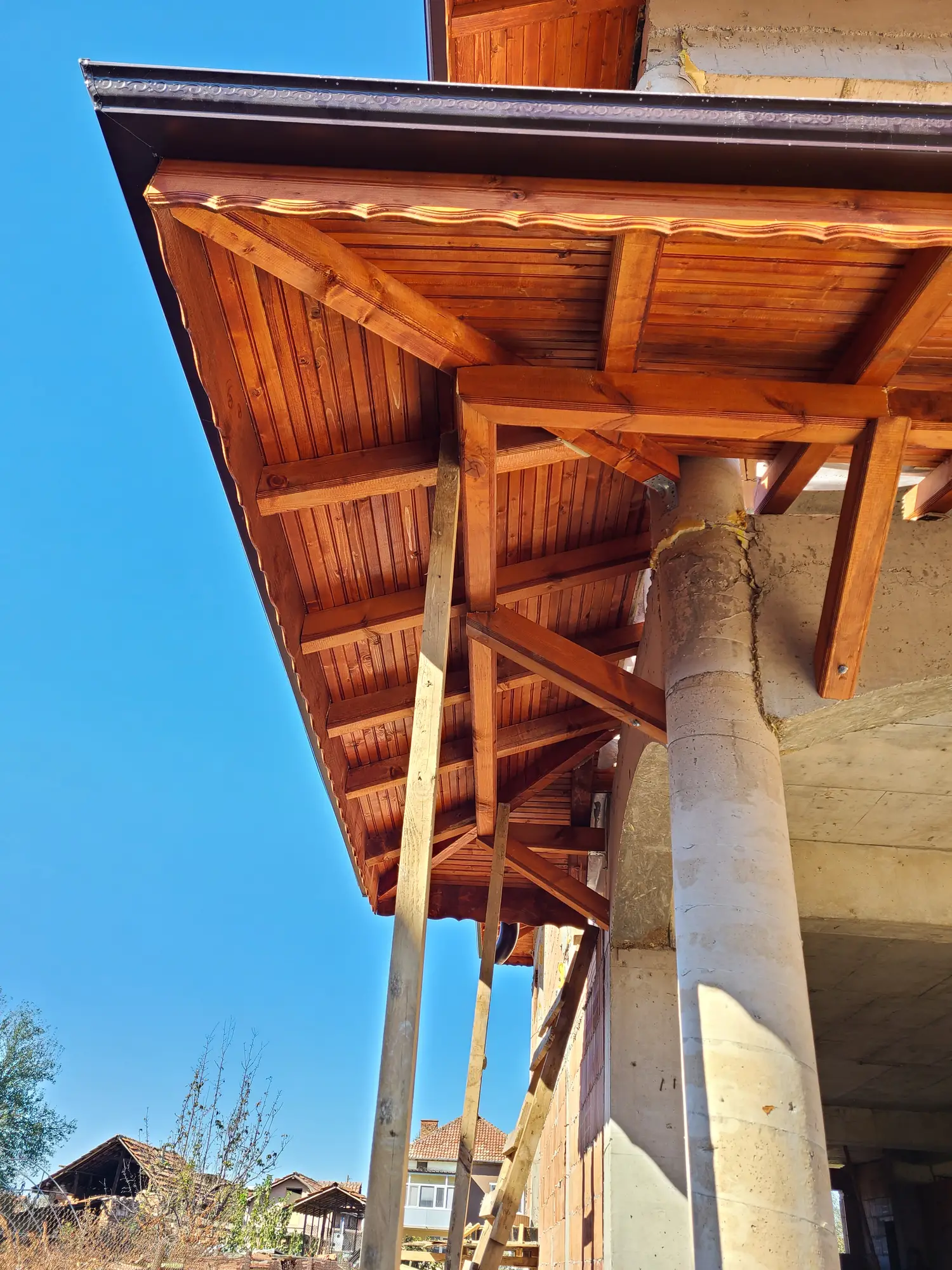 - Направа на дървена конструкция от основни греди 10х12 см и 10х10 за оребряването на покрива
