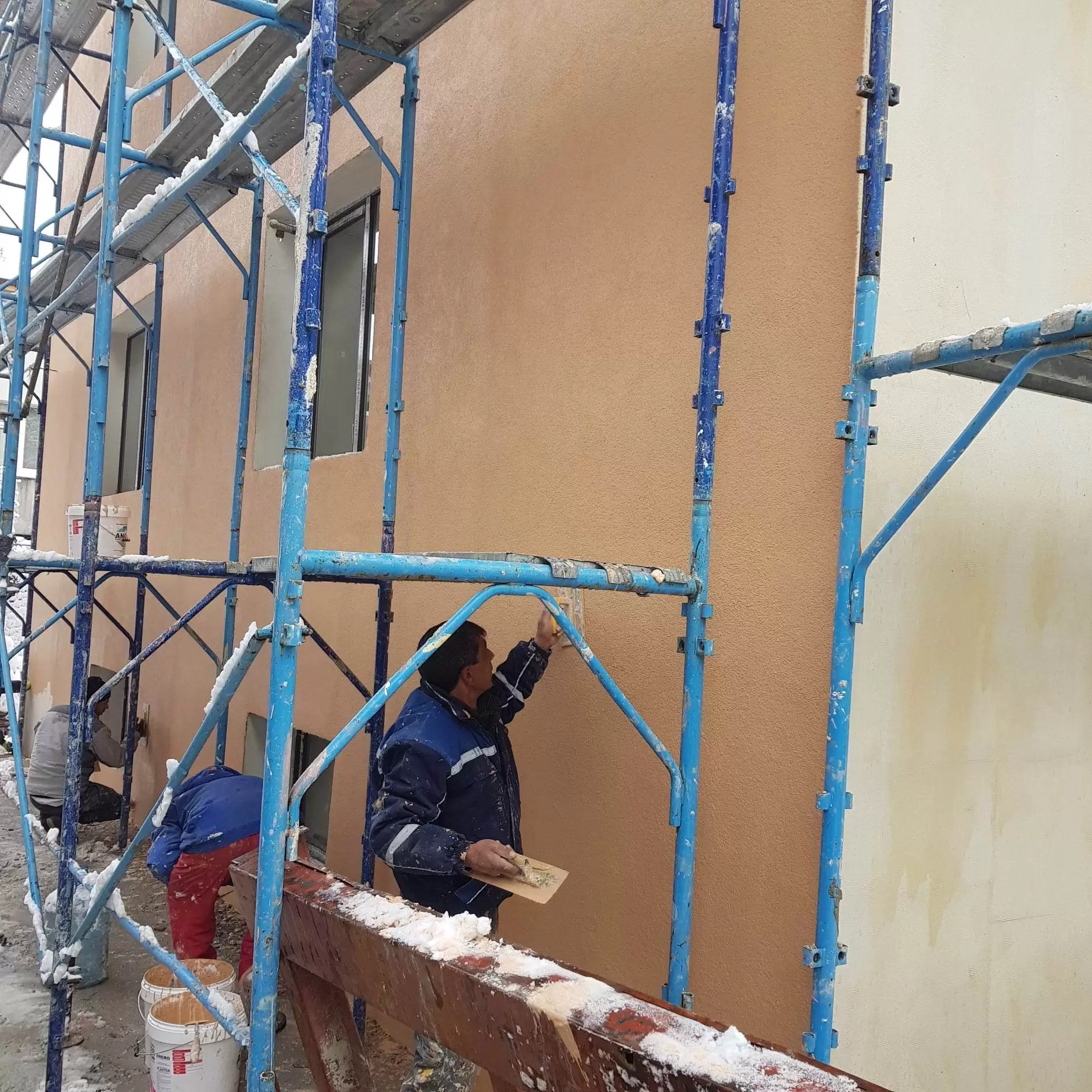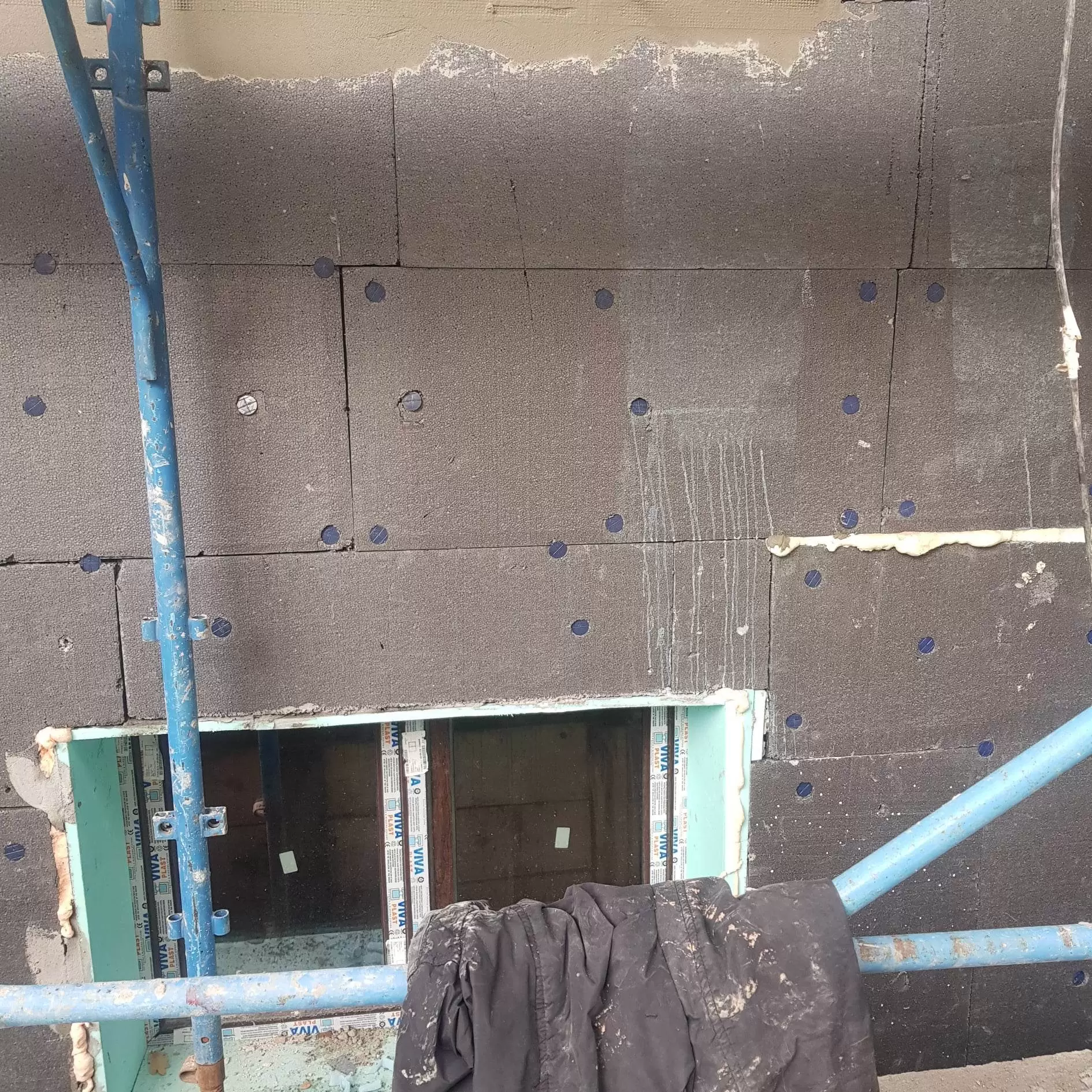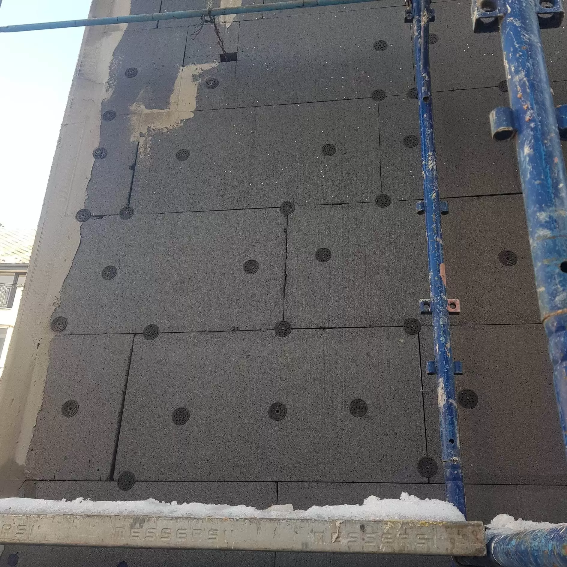Продължаваме с топлоизолирането на фасадните стени на къщата. Използваме 10 см графитен стиропор с добри топлоизолационни качества. Плочите се залепват към стената с подходящо лепило и се фиксират с пластмасови дюбели. Върху стиропора се монтира армирана мрежа, която осигурява по-голяма здравина на системата. Накрая нанасяме 3 ръце шпакловка, която изглажда повърхността и създава основа за последния слой – минералната силиконова мазилка. Тя се полага с четка или мистрия в желания цвят.