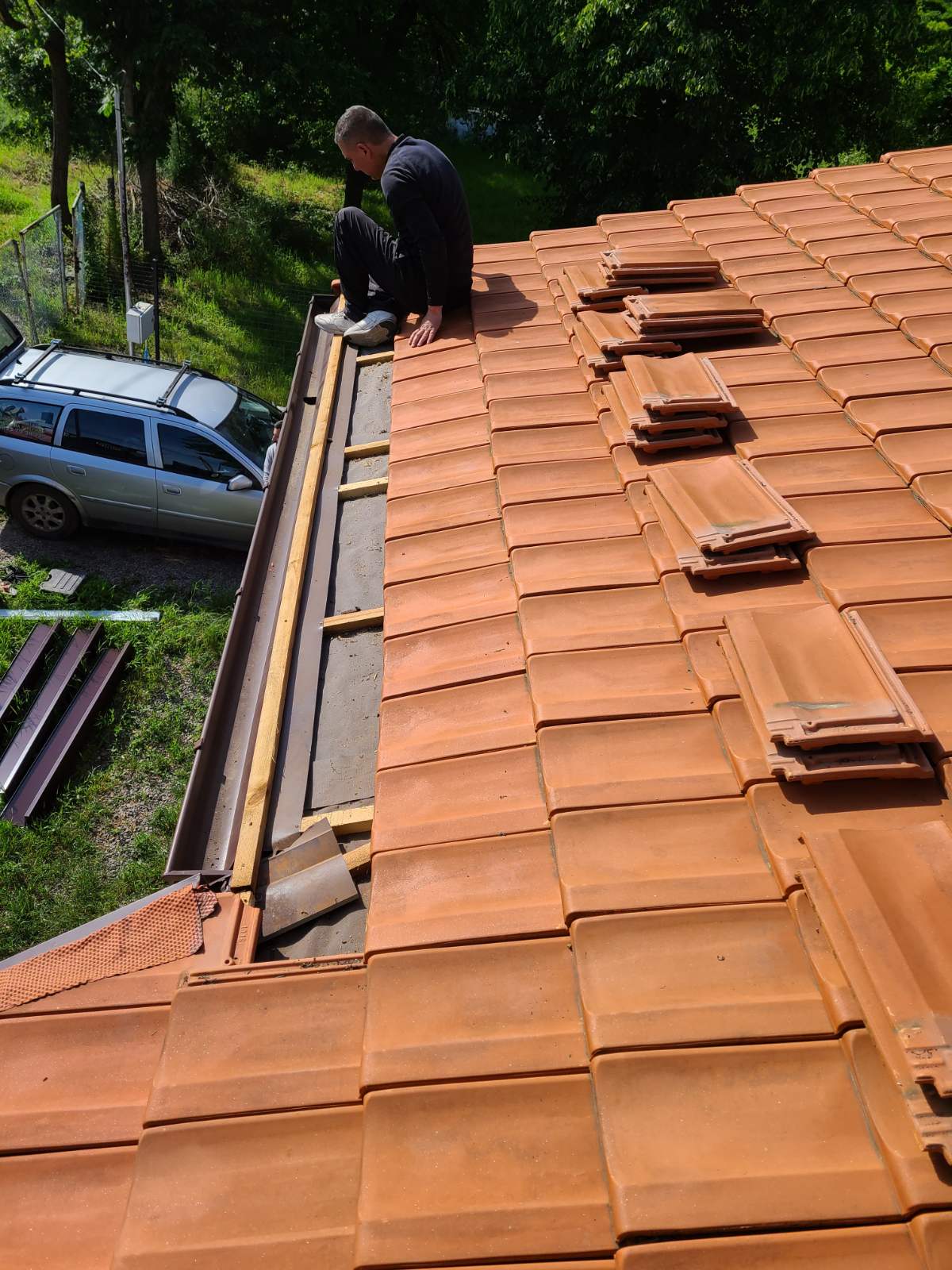 Като първа стъпка демонтирахме старите и счупени керемиди. На тяхно място монтирахме нови керемиди марка Tondach в червен цвят. Използвахме професионално оборудване, за да подредим керемидите плътно една до друга, без да остават незапълнени пролуки.