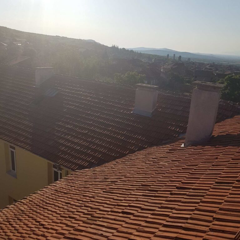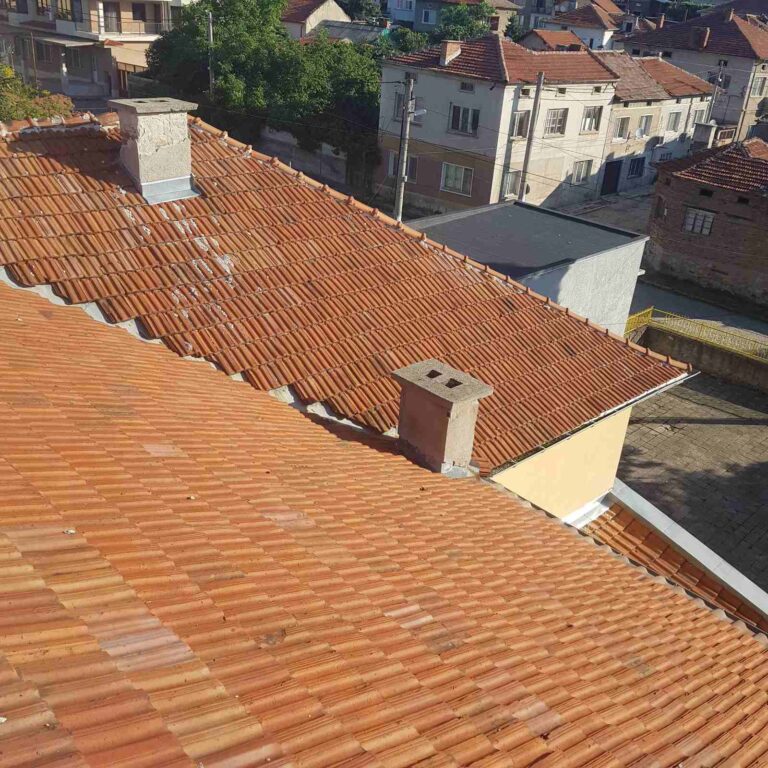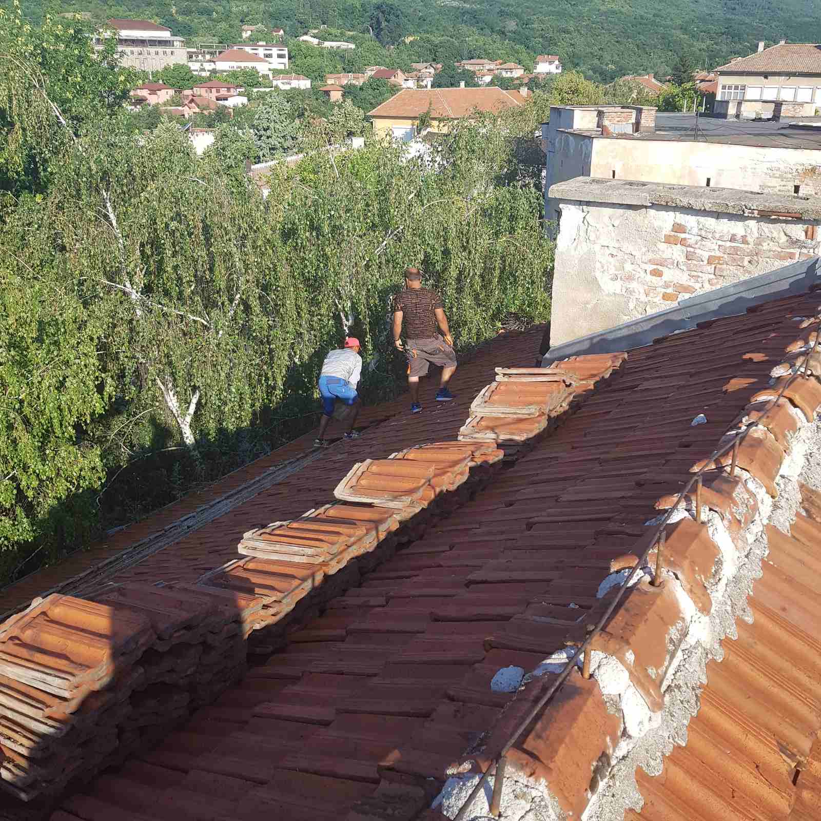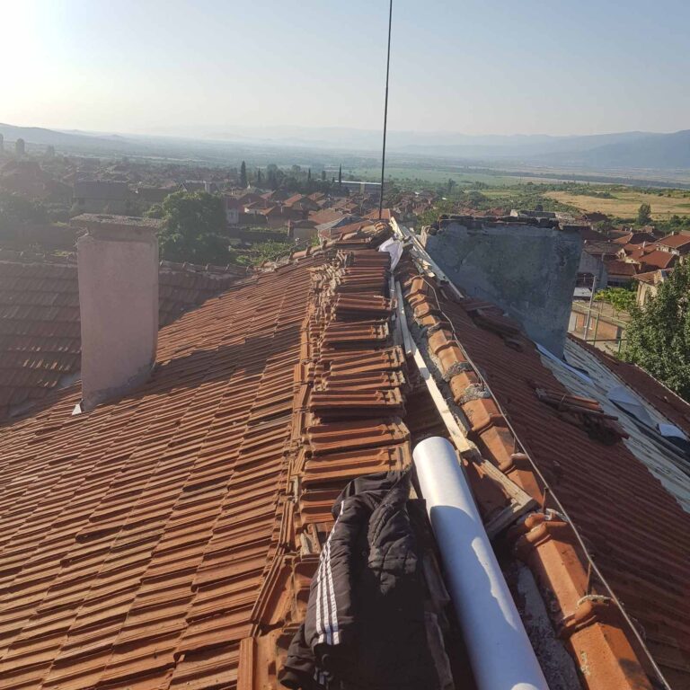 Върху готовата скара плътно подредихме керемидите в редове, като внимавахме за правилното им застъпване. Всяка керемида се фиксира с два керемидени пирона към летвите. Направихме внимателно подмазване на керемидените капаци по цялото било с подходящ разтвор. След това, обърнахме внимание и на друг важен елемент – улуците и водосточните тръби. При обхода установихме, че на места улуците бяха амортизирани и ръждясали. За да осигурим безпроблемно оттичане на дъждовната вода, демонтирахме старите улуци и ги подменихме с нови от поцинкована ламарина с ПВЦ покритие. Новите улуци се закрепиха здраво към носещата конструкция с обкантващи скоби през 60 см. Също така подменихме и старите водосточни тръби, които бяха запушени и ръждясали. На тяхно място монтирахме нови ПВЦ тръби ф110 мм за ефективно отвеждане на дъждовната вода от покрива. Тръбите се свързаха с ъглови муфи за по-добра стабилност. Извършихме внимателно почистване на всички остатъци от ремонта и извозване на строителните отпадъци. По този начин предадохме обекта чист и готов за експлоатация от учениците и преподавателите.